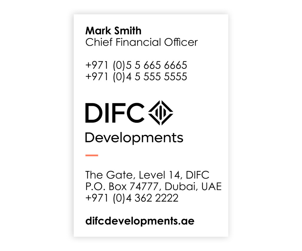 This is a notional example of DIFC Developments folder. When creating artworks it is permissible for use of special printing techniques such as varnishes or foils as deemed necessary.