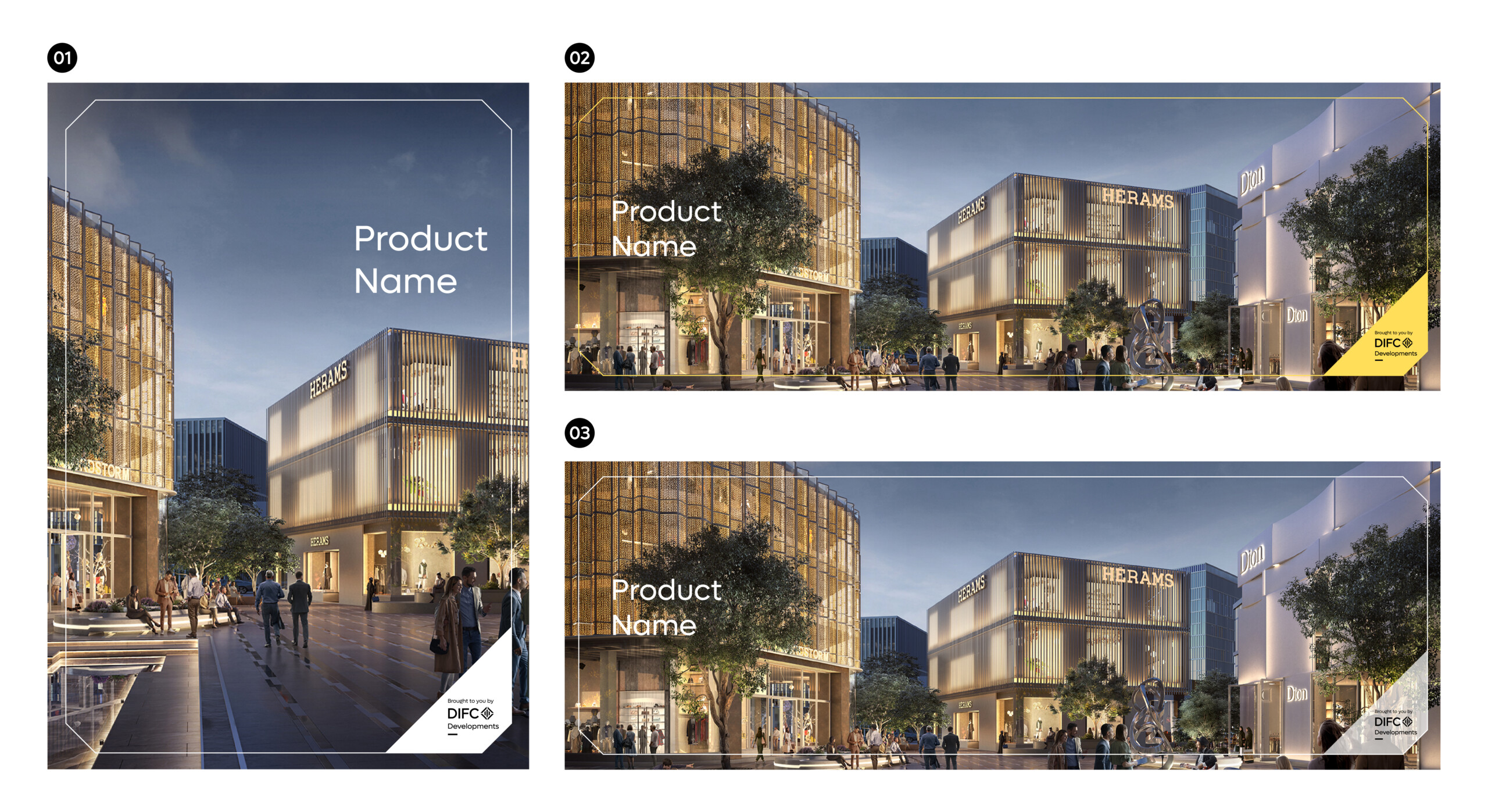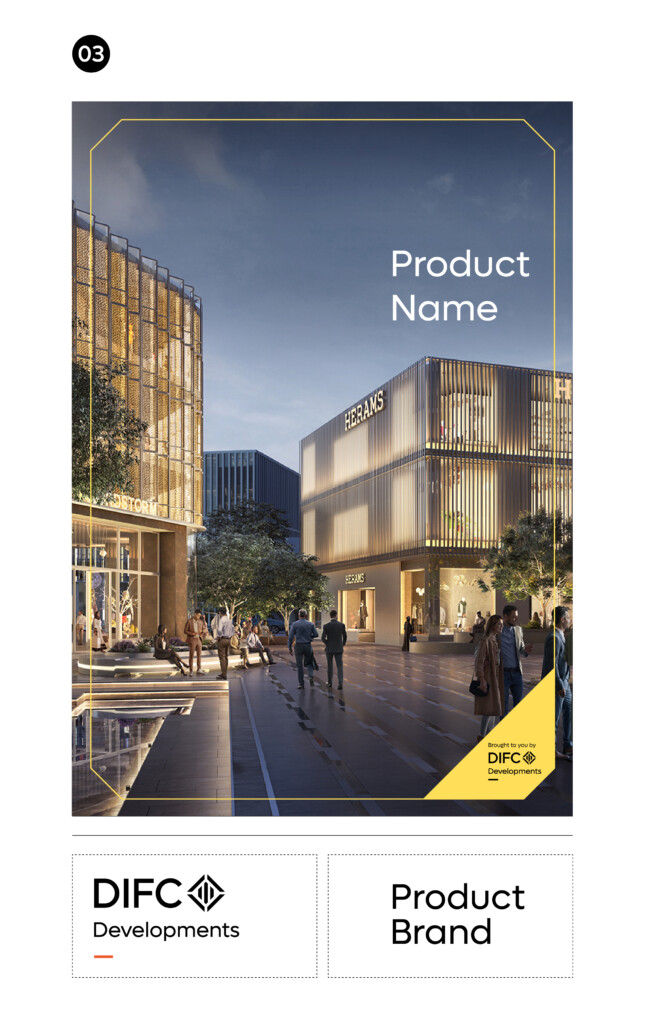 Note: The colour of the frame can adopt the featured product brand colours, or a complementary colour from the DIFC Developments secondary or tertiary palette.